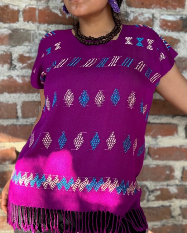 Huipil corto con barbas color morado, bordado a mano con hilo de algodón
