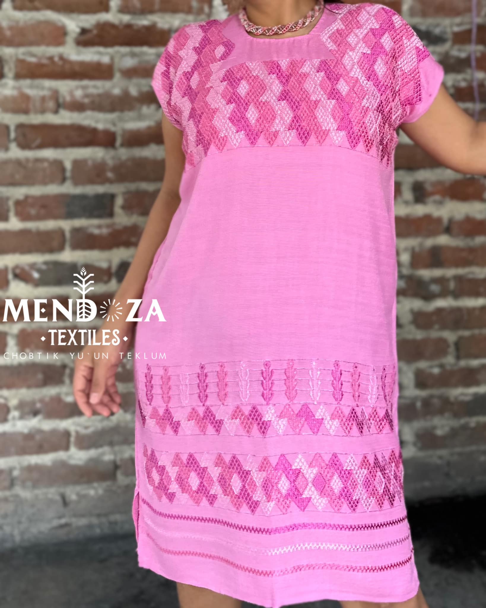 Huipil largo rosa claro bordado a mano con hilo de algodón