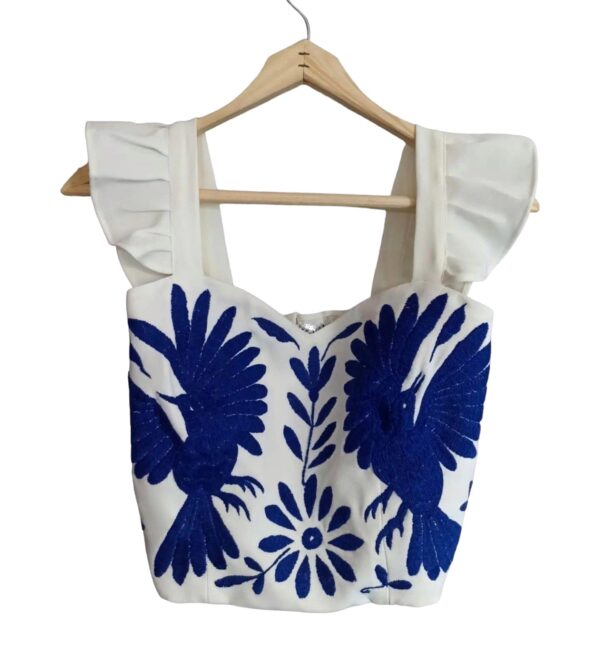 Topcrop en bordado Tenango a mano con hilo de algodón azul rey